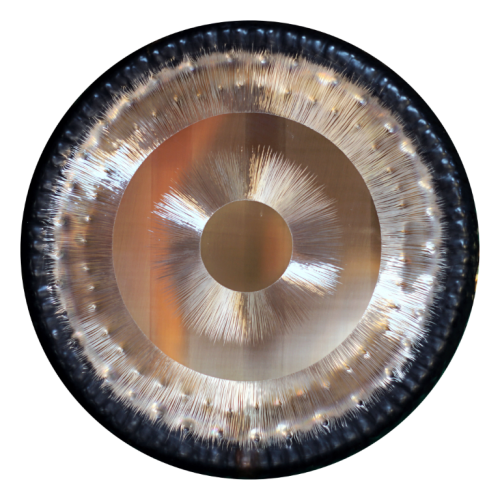 Handgefertigter atemberaubender Gong mit einem wunderschönen, kristallklaren kosmischen, offenen, ätherischen und langanhaltenden Klang, der von den tiefsten Tönen über reiche mittlere bis hin zu höheren Frequenzen graduiert. Durchmesser 42" - 105 cm.